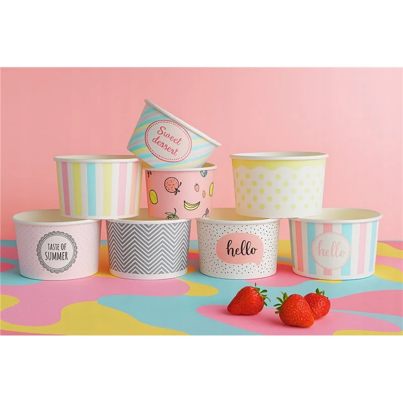 Ez a mintás fagylaltos pohár ideális választás elviteles rendelésekhez, street food egységekbe, rendezvényekre vagy akár food truckok számára is. Strapabíró kialakításának köszönhetően jól tartja a formáját, nem ázik át könnyen, így megbízható megoldást nyújt a mindennapi használat során.